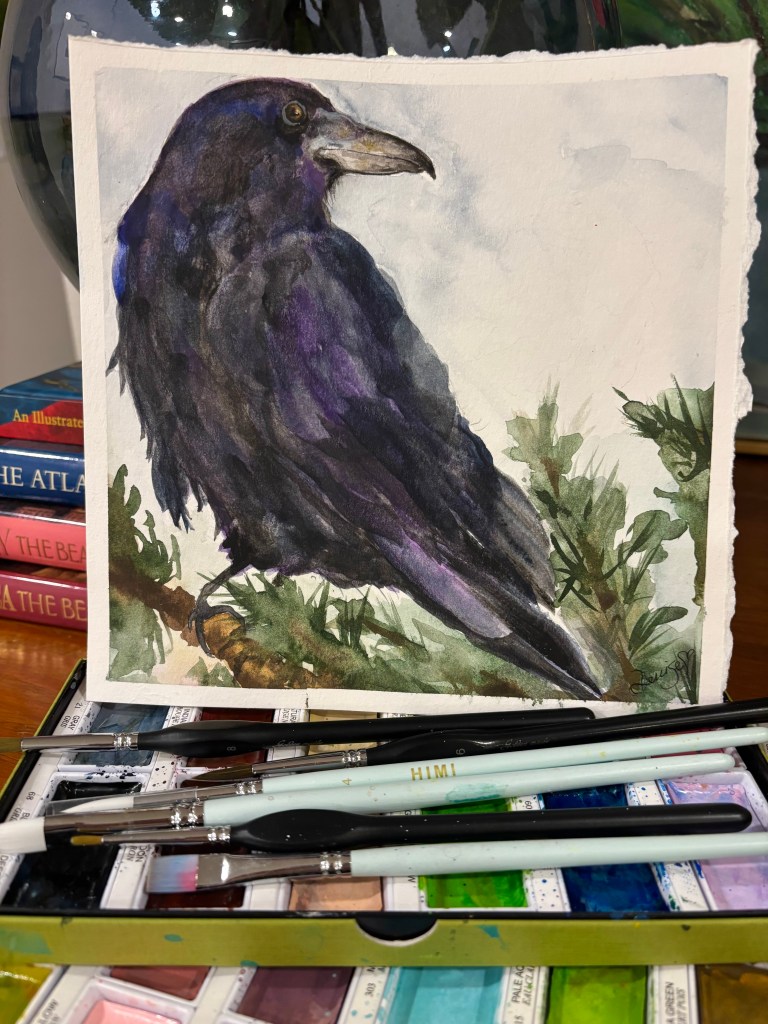 …the two cheeky crows on my walk along the lake the other day, that seemed to follow me flying from limb to limb as I walked, they “talking to me” I interacting and talking back, even flew to the ground to sit and share time with me as I sat on a log enjoying a quiet moment by the water. They inspired these memories and this painting-though this photo does not do it justice, it looks a bit splotchy on camera? (looks a bit rough and rustic) however in in realtime, I believe this to be one of my favorite paintings/illustrations to date🥰❤️😁maybe it’s just the lovely reminiscing🤷♀️